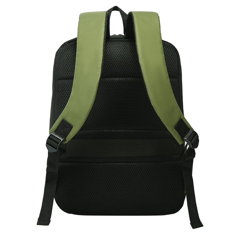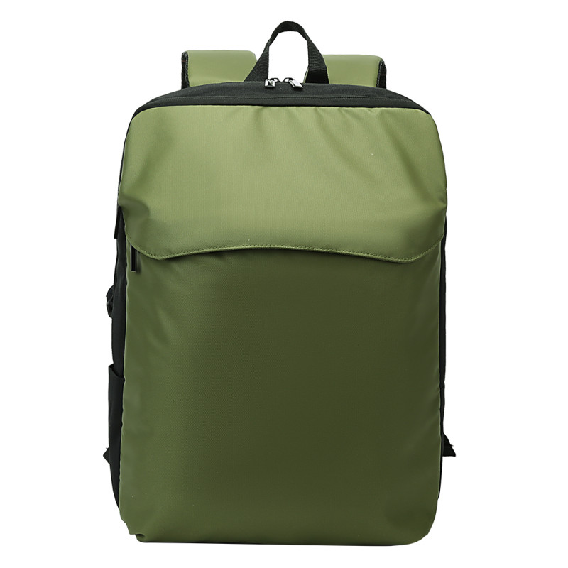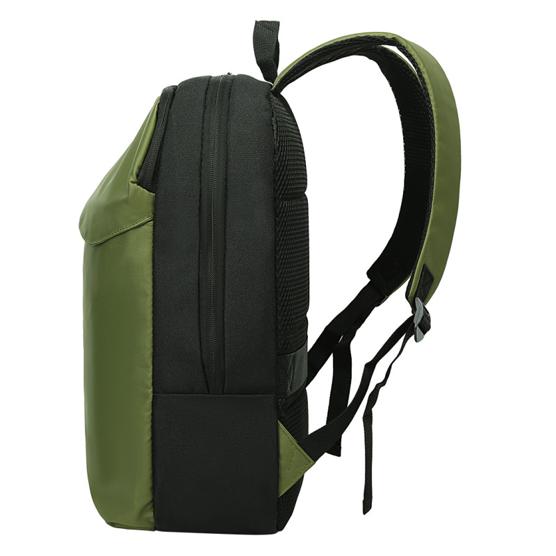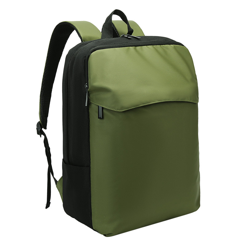 Backpack with one main compartment, front pocket with zipper, compartment for 15" laptop, two side pockets