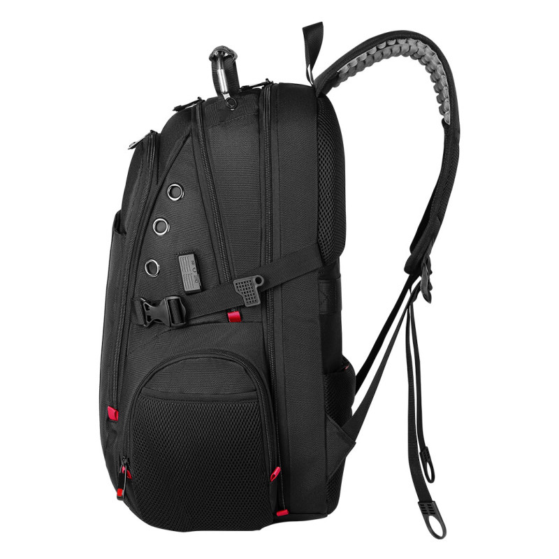 Backpack with three main compartments, padded compartment for 17' laptop, tablet compartment, front pocket, two mesh side pockets and two pockets with zipper on the sides, USB connector and earbud connector, secret pocket with zipper on the back