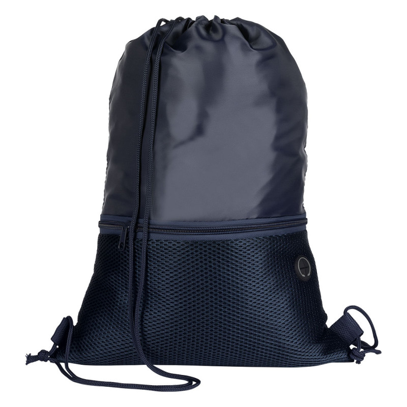 Drawstring bag with adjustable drawstrings, one mesh pocket with zipper on the front and earphone accessory