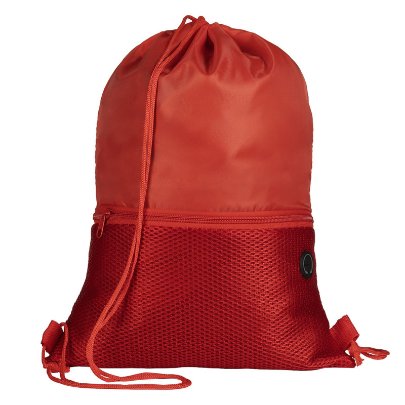 Drawstring bag with adjustable drawstrings, one mesh pocket with zipper on the front and earphone accessory