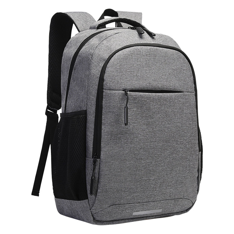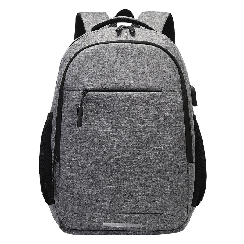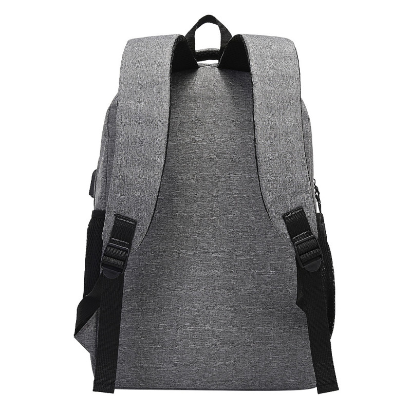 Backpack with two main compartments, padded compartment for 15" laptop, pocket with zipper on the front, two mesh pockets on the sides, USB connector
