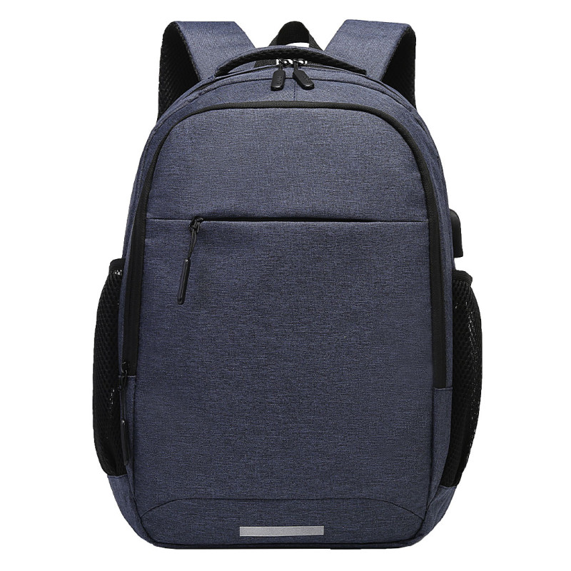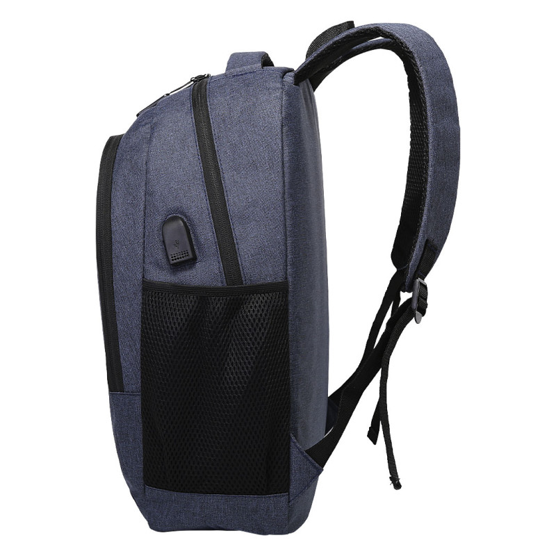 Backpack with two main compartments, padded compartment for 15" laptop, pocket with zipper on the front, two mesh pockets on the sides, USB connector