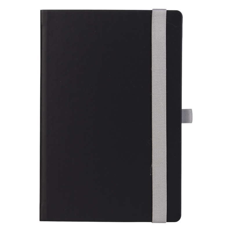 A5 notebook with rounded edges, elastic band, pen holder and pocket on the inside cover