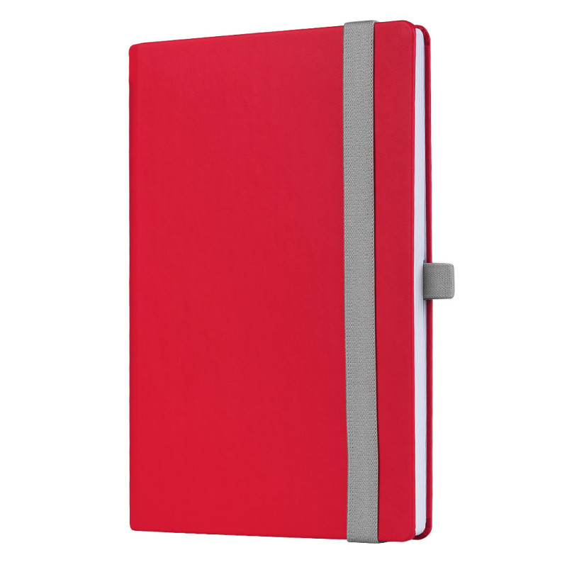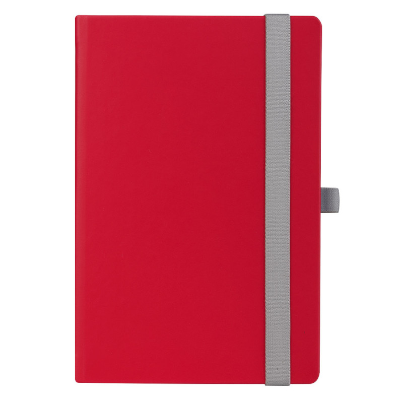 A5 notebook with rounded edges, elastic band, pen holder and pocket on the inside cover