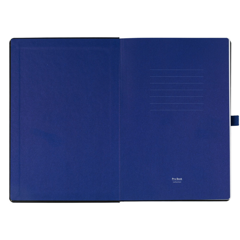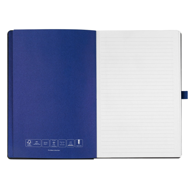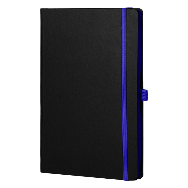A5 notebook with rounded edges, colored book block edge matching color with elastic band, colored endsheets, elastic band and pen holder