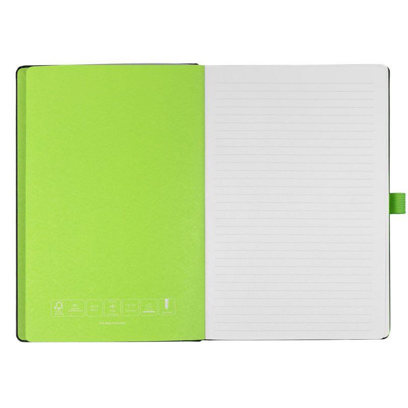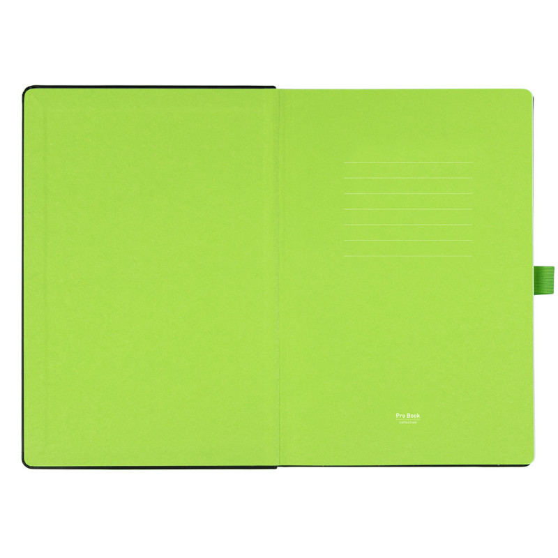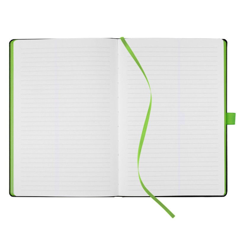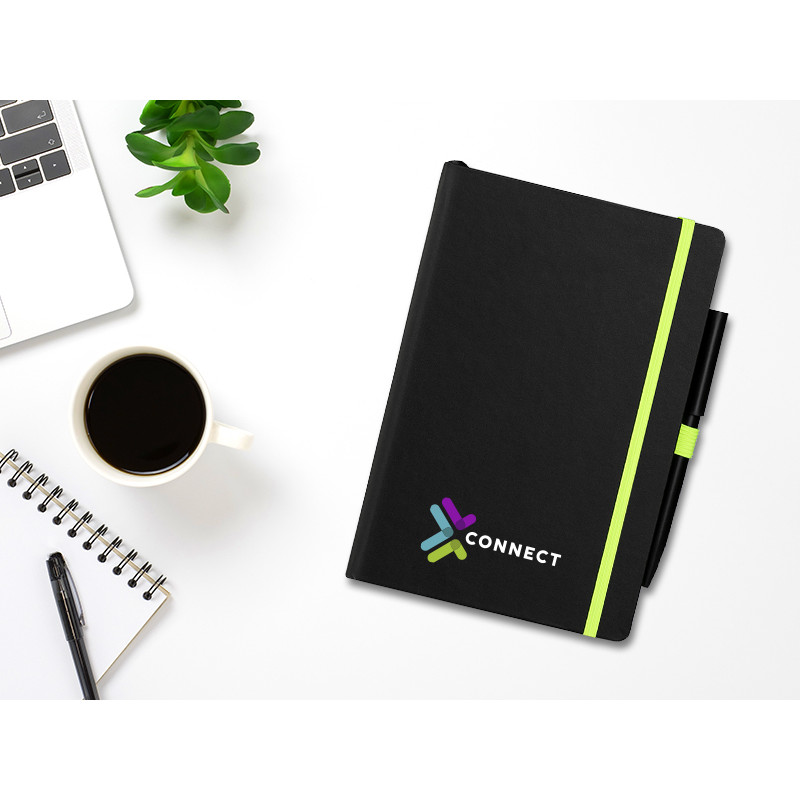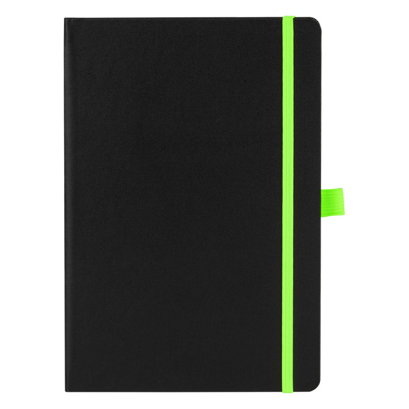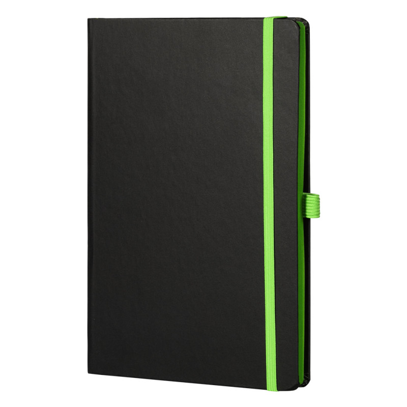 A5 notebook with rounded edges, colored book block edge matching color with elastic band, colored endsheets, elastic band and pen holder