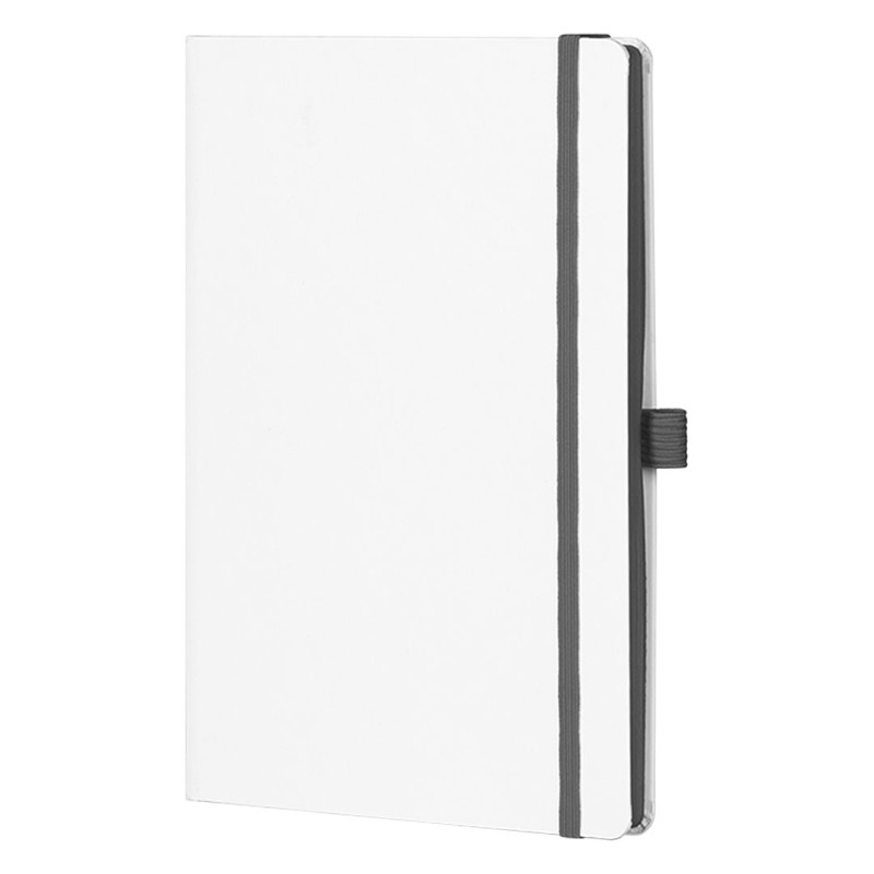 A5 notebook with rounded edges, colored book block edge matching color with elastic band, colored endsheets, elastic band and pen holder