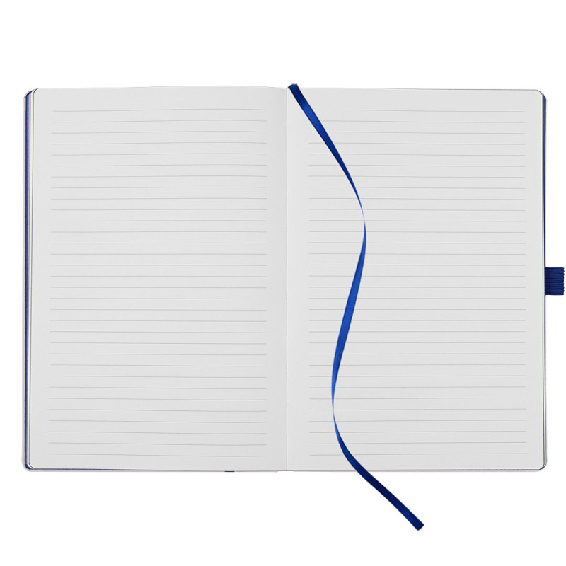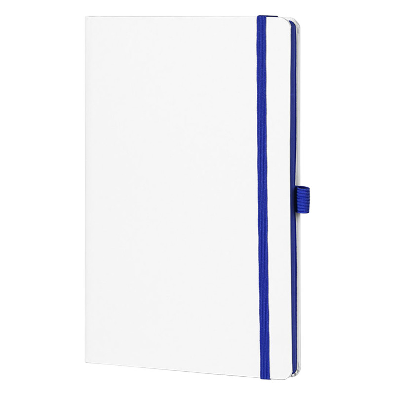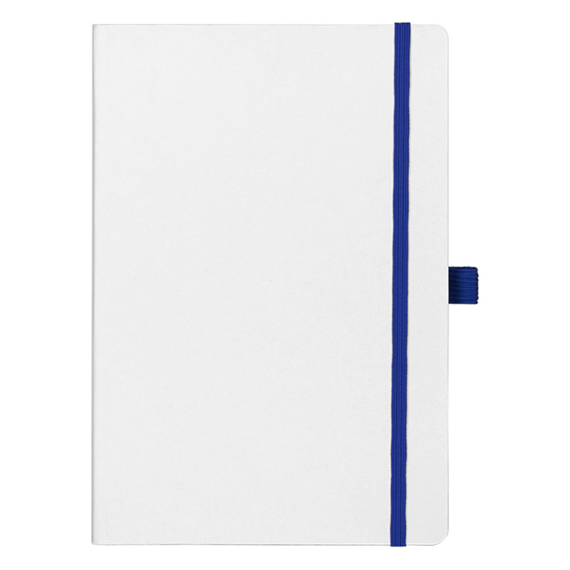 A5 notebook with rounded edges, colored book block edge matching color with elastic band, colored endsheets, elastic band and pen holder