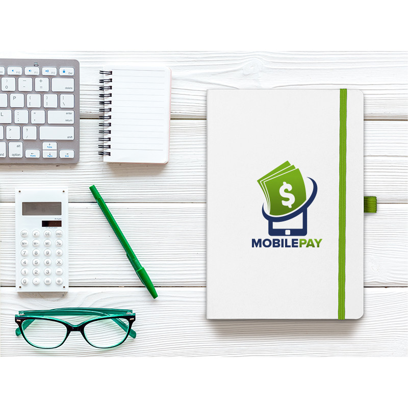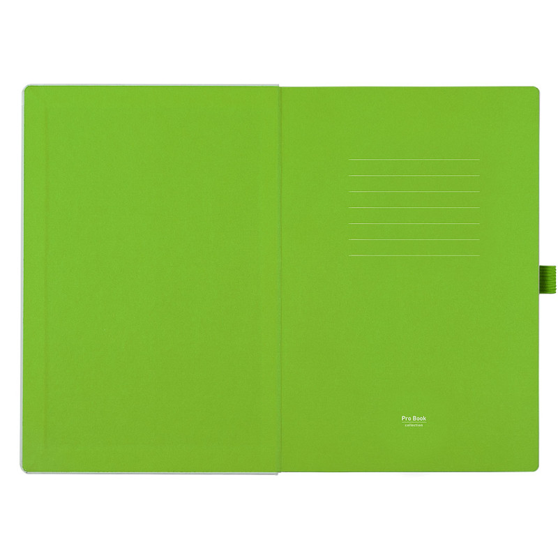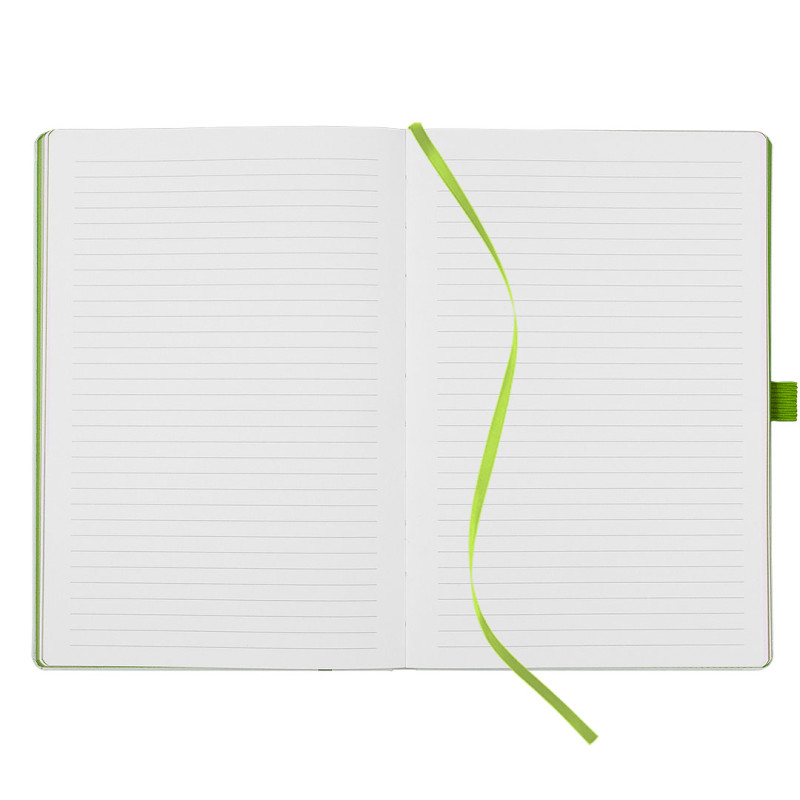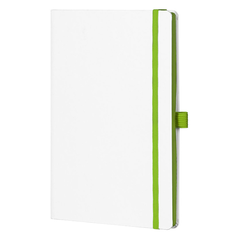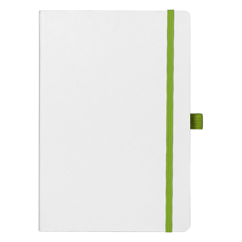 A5 notebook with rounded edges, colored book block edge matching color with elastic band, colored endsheets, elastic band and pen holder