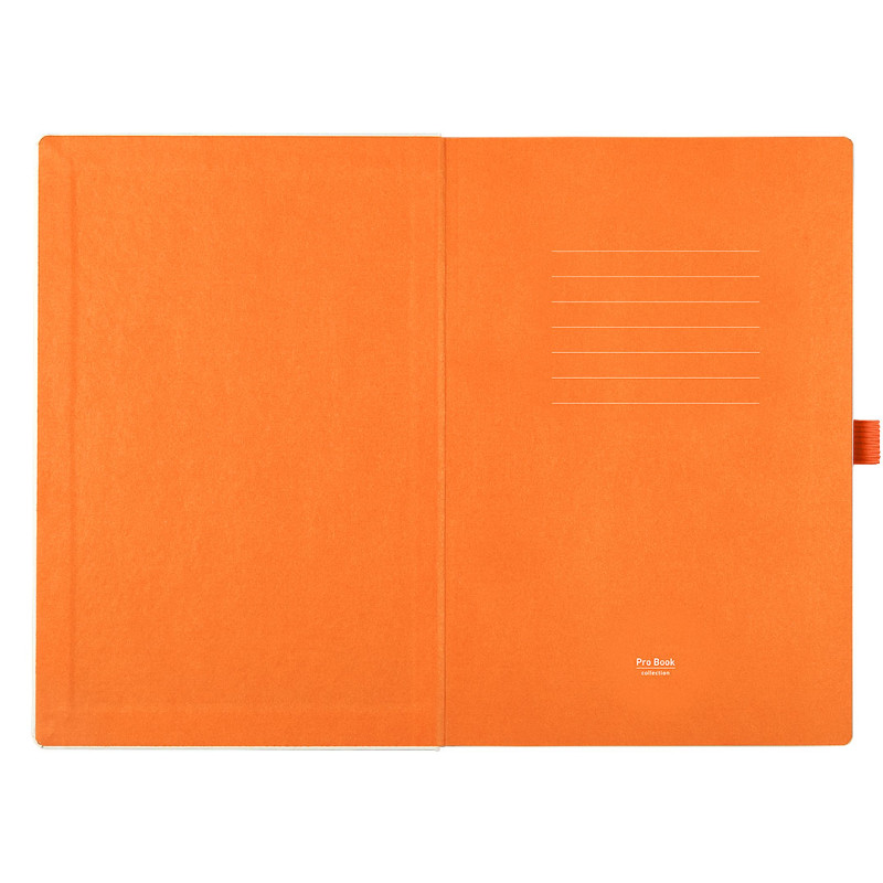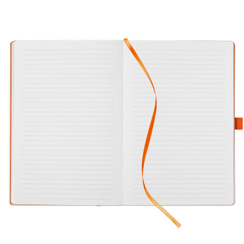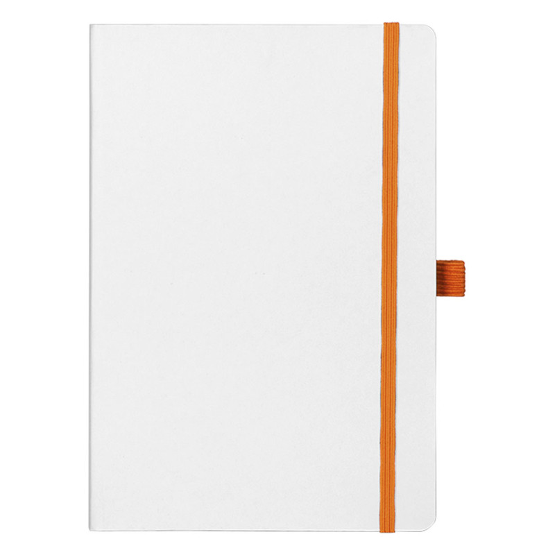 A5 notebook with rounded edges, colored book block edge matching color with elastic band, colored endsheets, elastic band and pen holder
