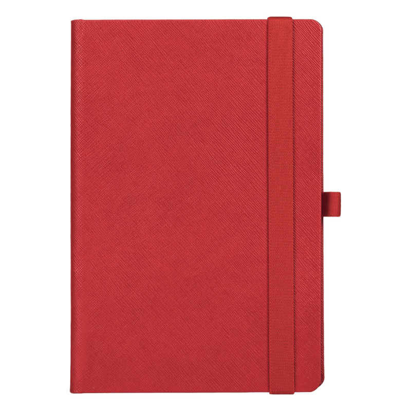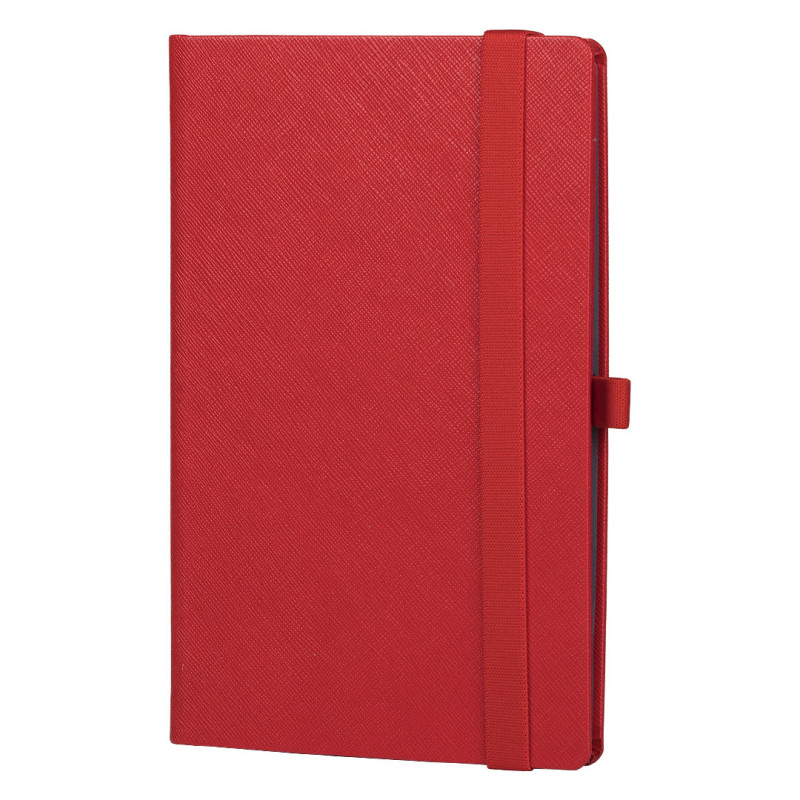 A5 notebook with rounded edges, colored book block edge matching color with cover, elastic band, pen holder and pocket on the inside cover