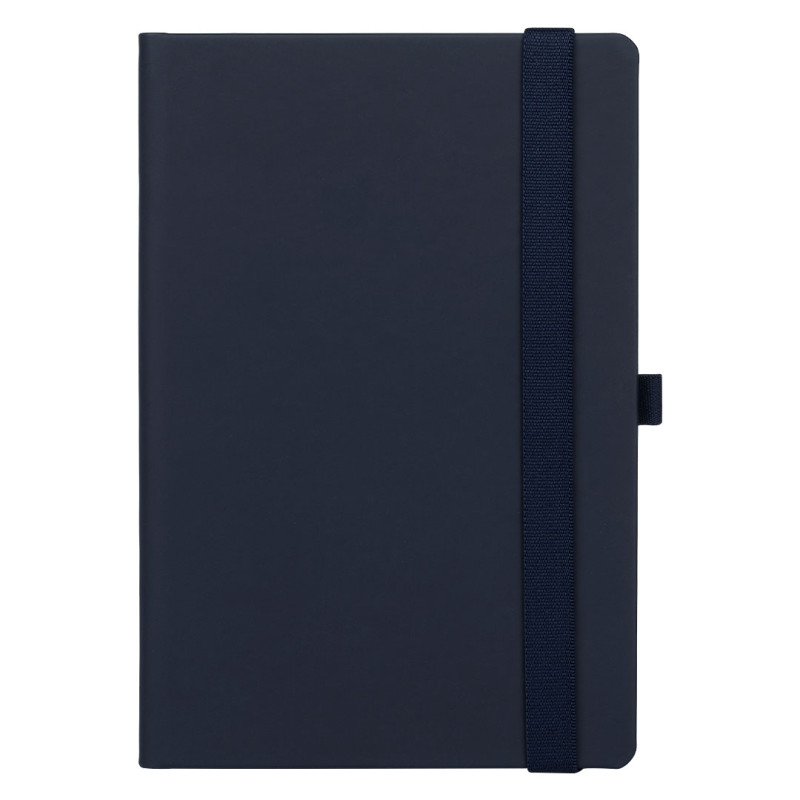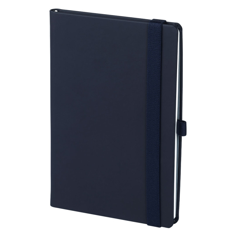 A5 notebook with rounded edges, elastic band, pen holder and pocket on the inside cover
