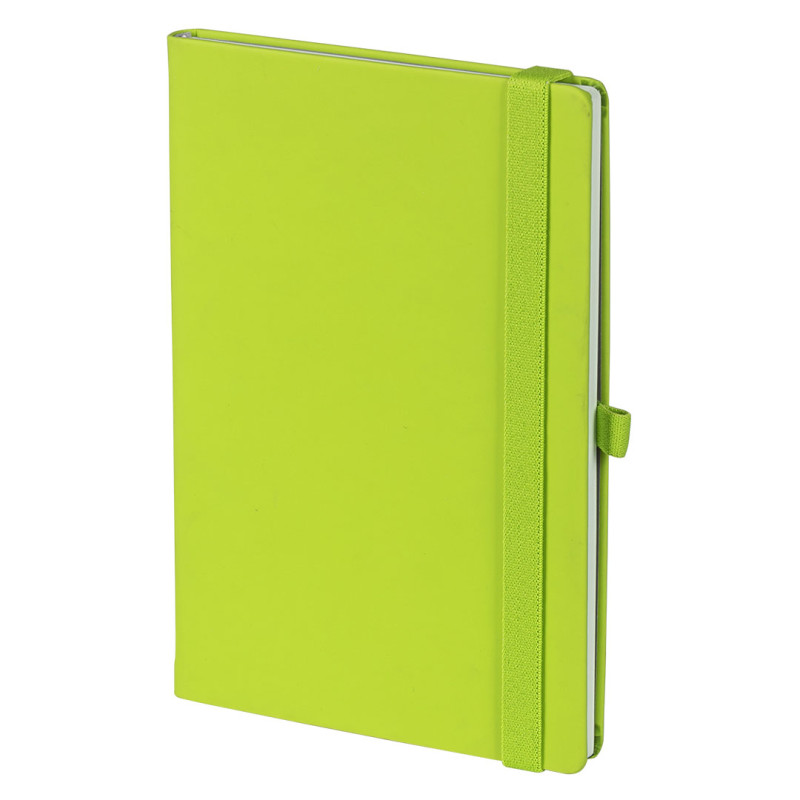A5 notebook with rounded edges, elastic band, pen holder and pocket on the inside cover