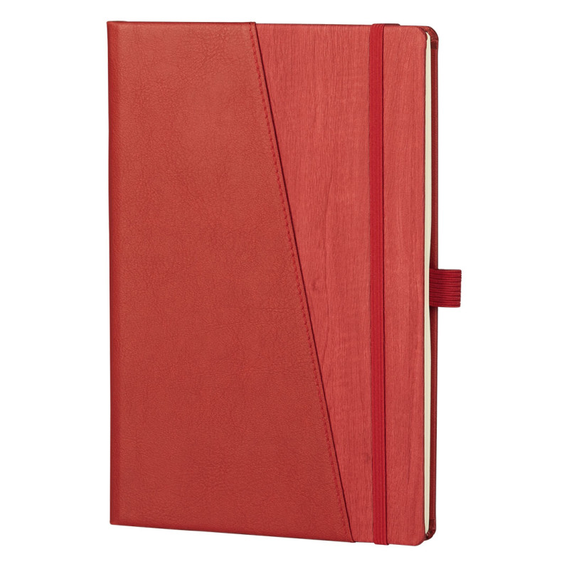 A5 notebook with rounded edges, elastic band, pen loop, pocket on the outside cover and pocket on the inside cover