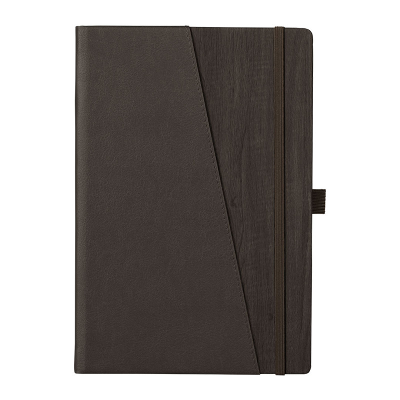 A5 notebook with rounded edges, elastic band, pen loop, pocket on the outside cover and pocket on the inside cover