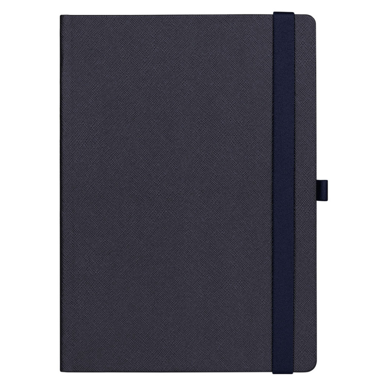 B5 notebook with rounded edges, colored book block edge matching color with cover, elastic band, pen holder and pocket on the inside cover