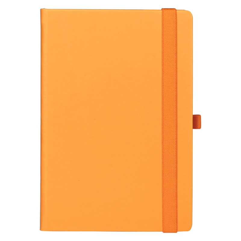 A5 notebook with rounded edges, colored book block edge matching color with cover, elastic band, pen holder and pocket on the inside cover