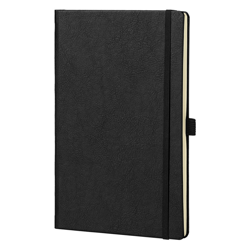 A5 notebook with rounded edges, elastic band, pen holder and pocket on the inside cover