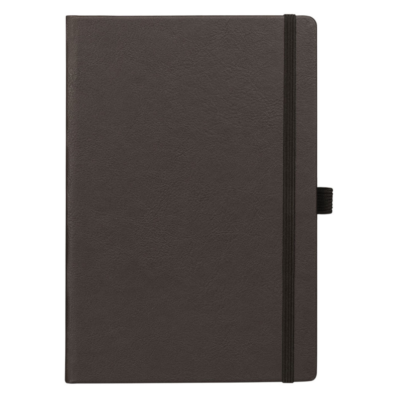 A5 notebook with rounded edges, elastic band, pen holder and pocket on the inside cover