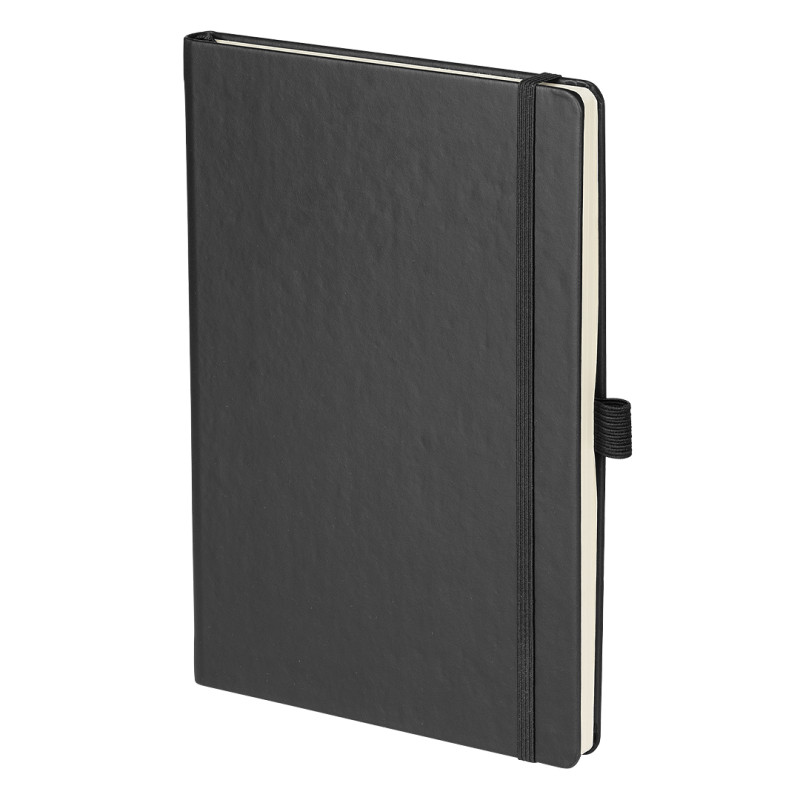 A5 notebook with rounded edges, elastic band, pen holder and pocket on the inside cover