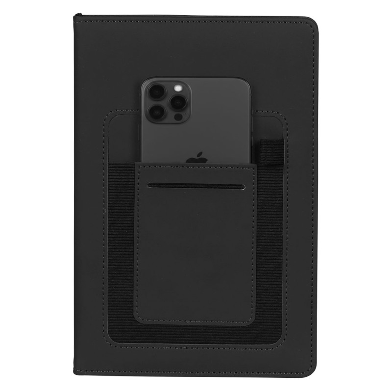 A5 notebook with rounded edges, pen holder and pockets on the outside cover