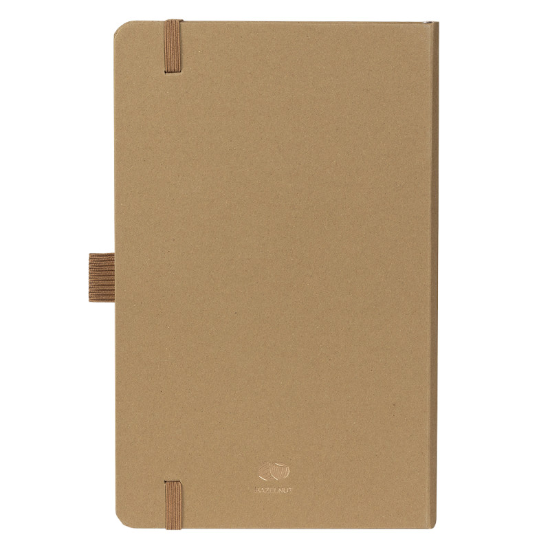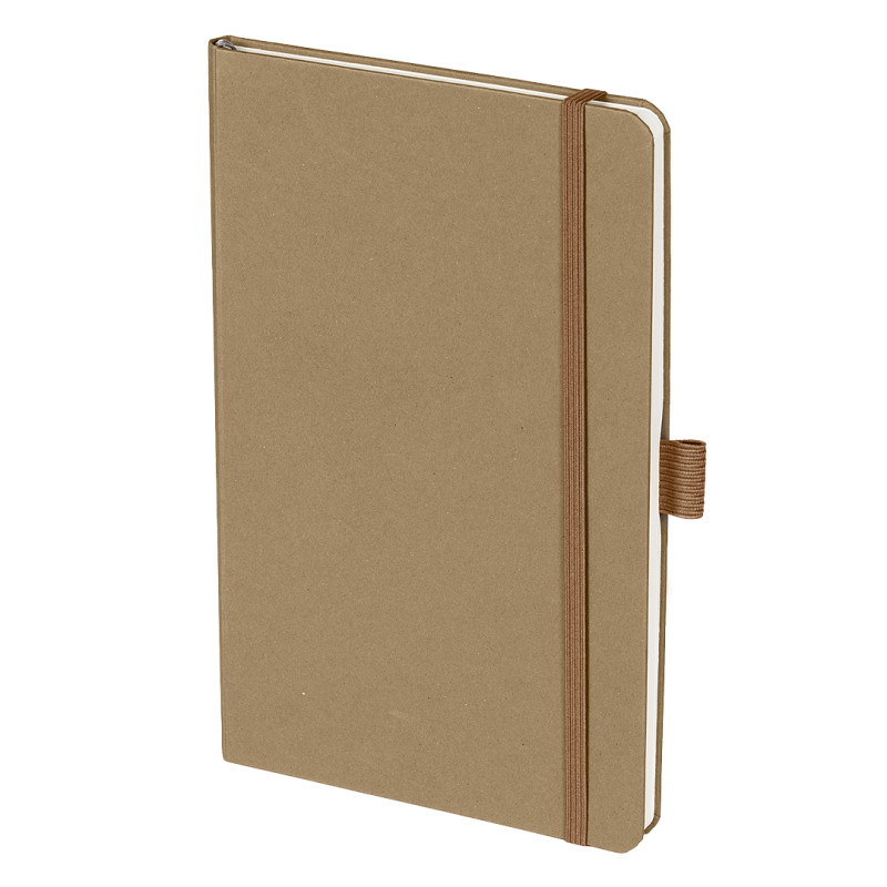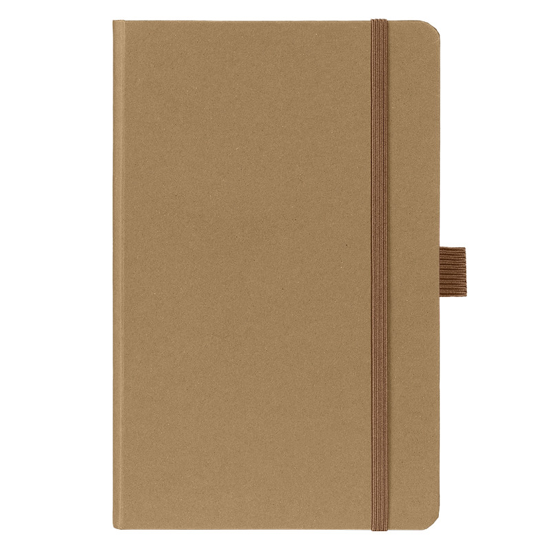 A5 notebook with rounded edges, elastic band, pen holder, cover is made of reclaimed bio material and paper, book bock is made of recycled paper