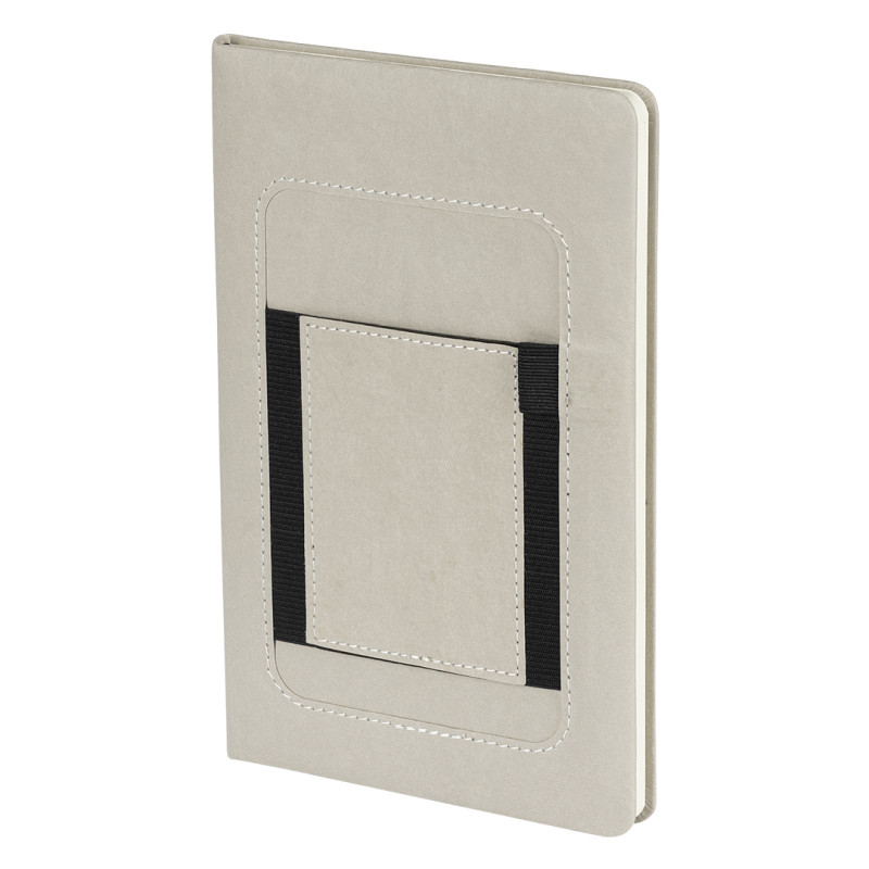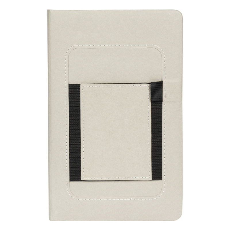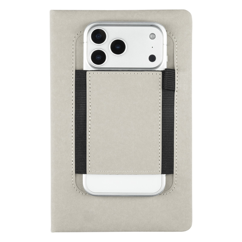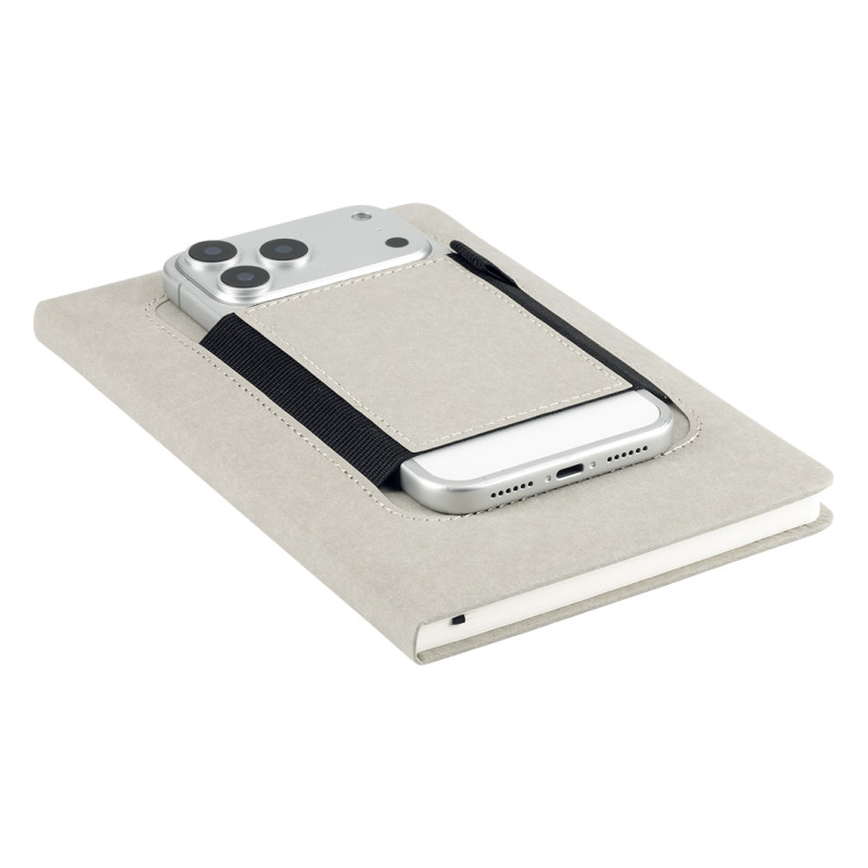 Notebook with rounded edges, elastic band, pen holder and pocket for mobile phone on the front cover