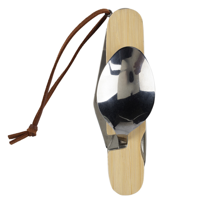 6 functions: spoon, bottle opener, reamer, corkscrew, fork, knife