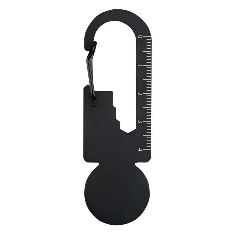 Multifunctional tool including: bottle opener, ruler, shopping cart coin, carabiner, hex driver wrench in various sizes, key holder