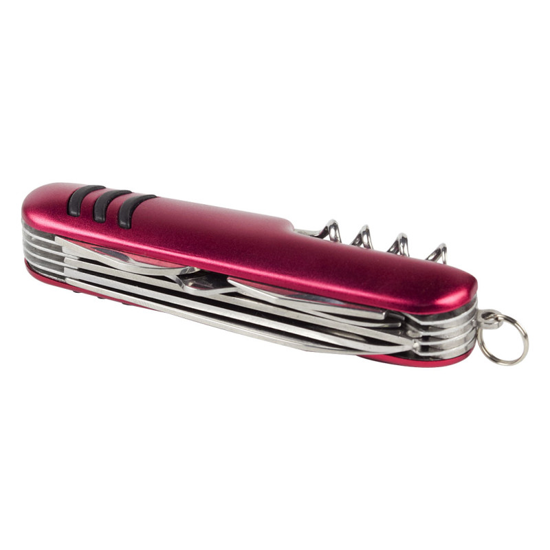12 function: knife, saw, scissors, can opener, scale remover, hook remover, bottle opener, Phillips screwdriver, steel file, file, leader, corkscrew