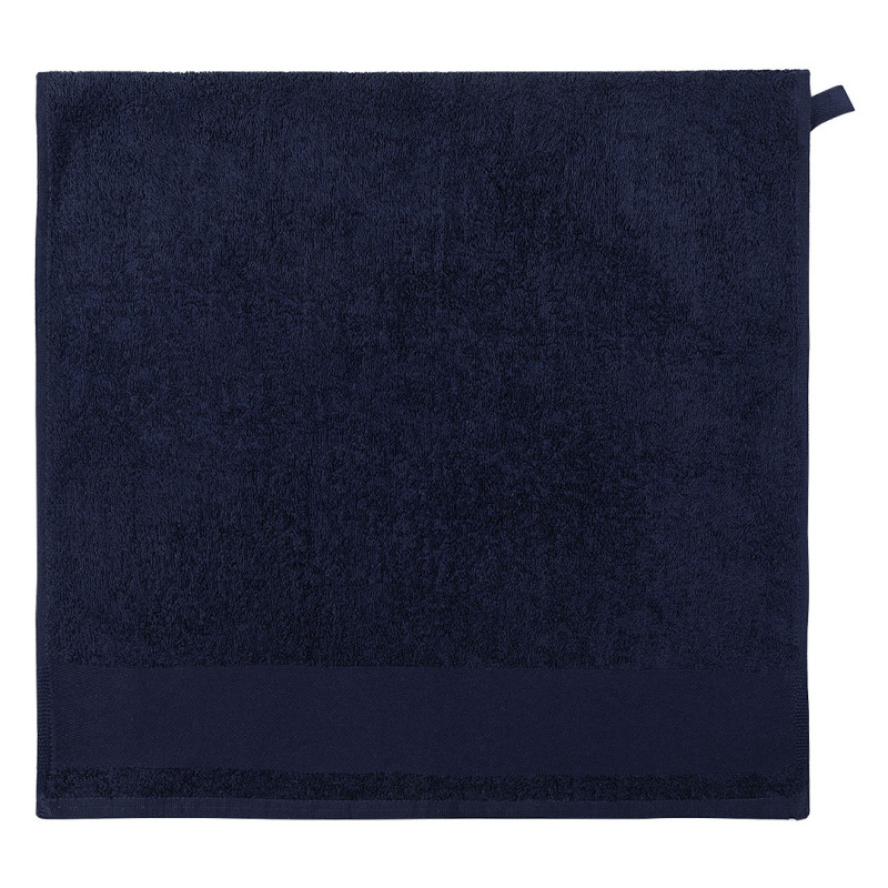 Towel, 380 g/m2, with 8 cm wide branding border and tone-to-tone cotton twill hanger