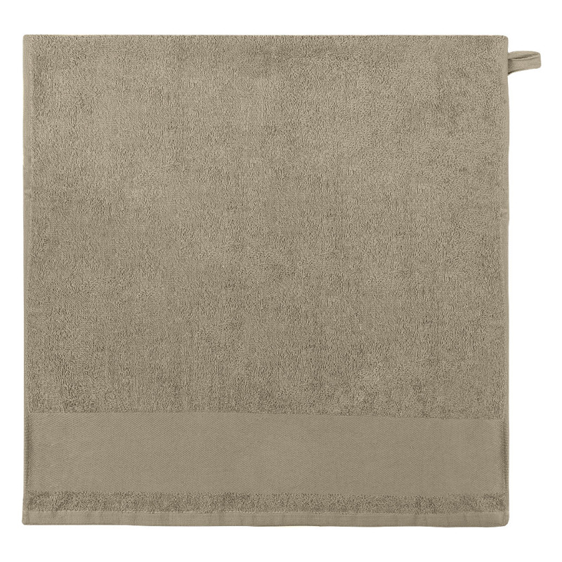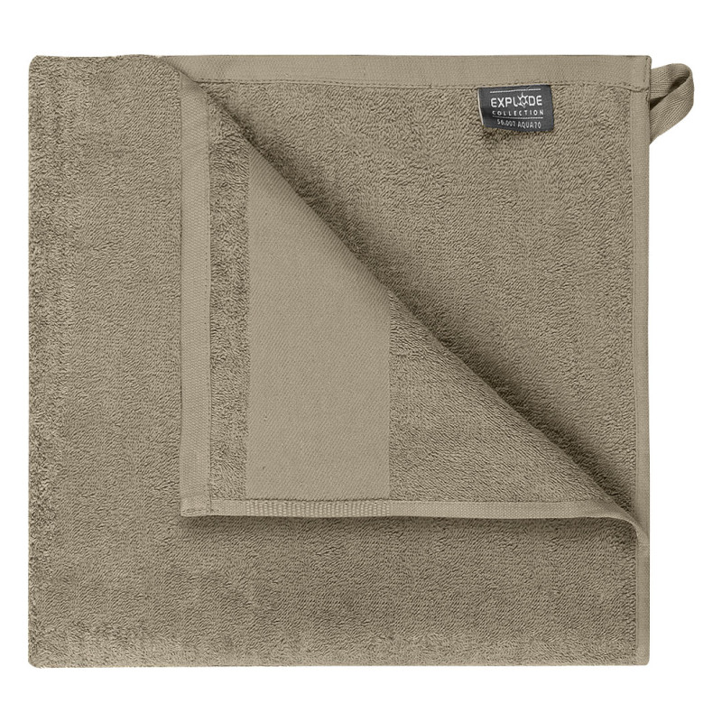 Towel, 380 g/m2, with 8 cm wide branding border and tone-to-tone cotton twill hanger