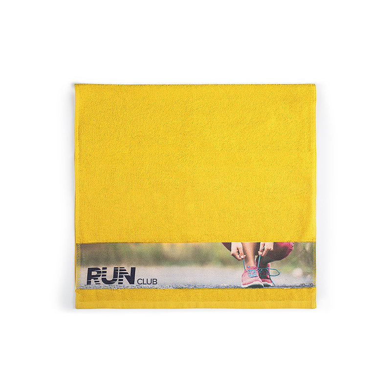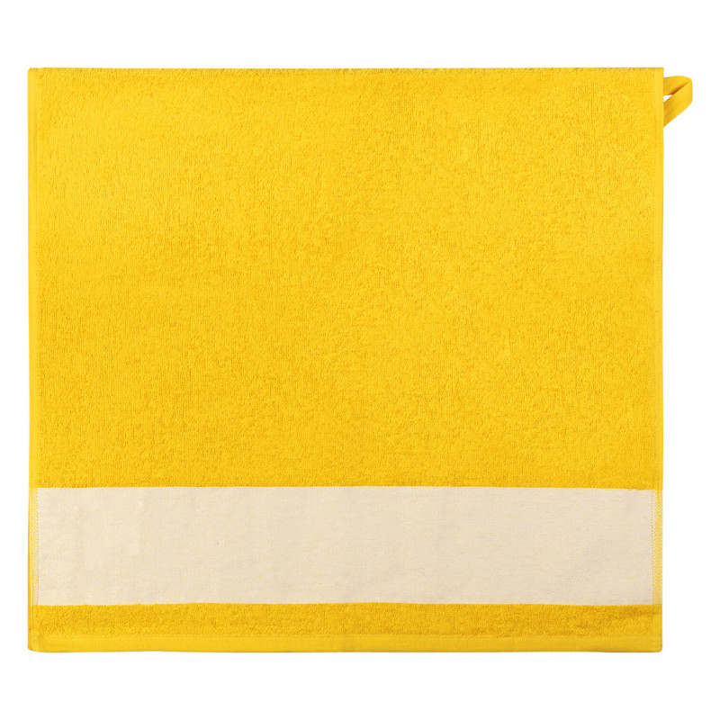 Towel, 380 g/m2, with 10 cm wide branding border for sublimation and tone-to-tone cotton twill hanger