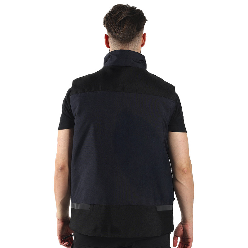 Workwear bodywarmer with a high collar, three chest pockets, two front pockets, an inner tablet pocket, and reflective details.