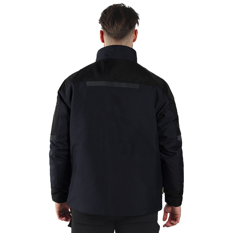 Work jacket with a high collar, elastic cuffs with hook-and-loop straps for sleeve width adjustment, three chest pockets, two front pockets, an inner tablet pocket, and reflective details.