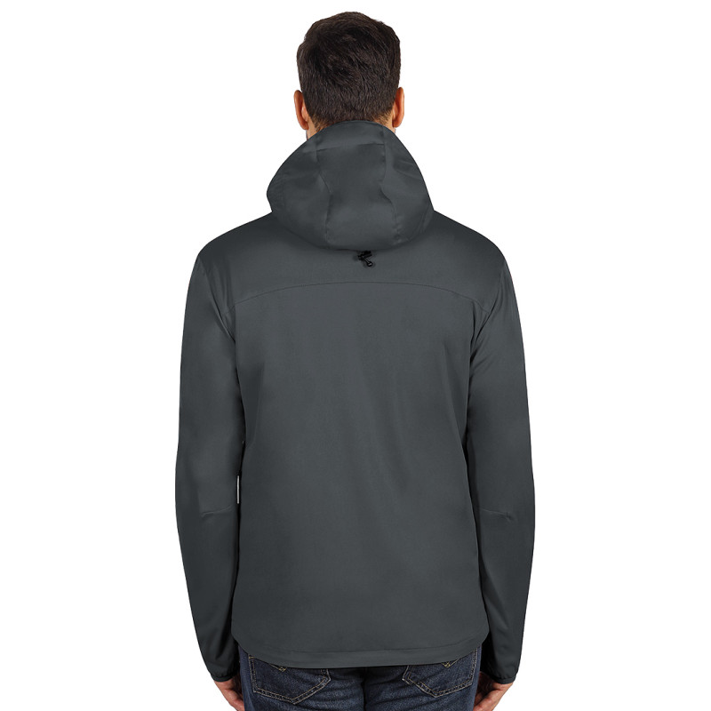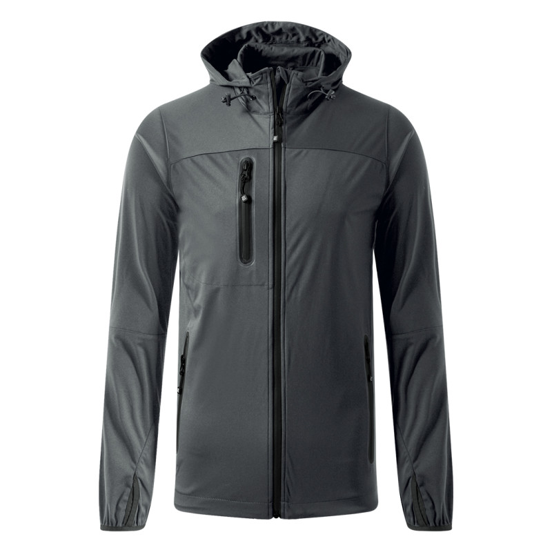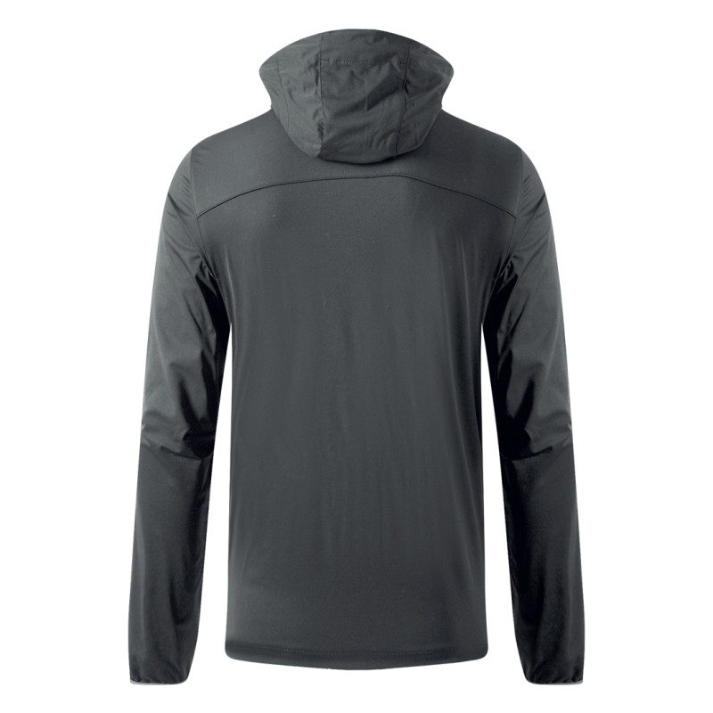 Jacket, elasticated adjustable drawstrings with stoppers in the hood, two front and chest zippered pocket, all zippers are waterproof, thumb opening on sleeves, back panel longer than the front