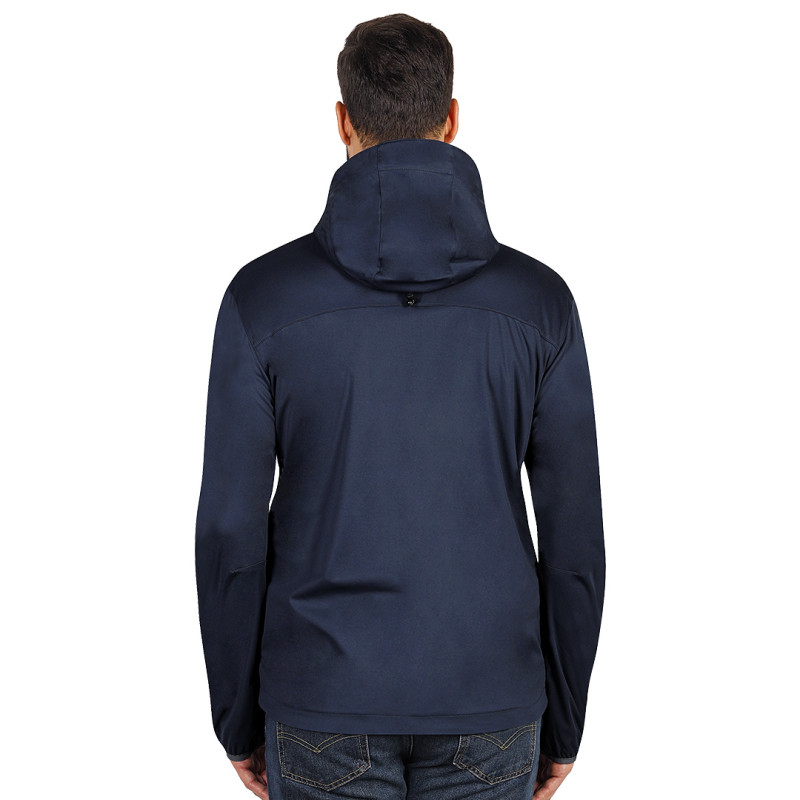 Jacket, elasticated adjustable drawstrings with stoppers in the hood, two front and chest zippered pocket, all zippers are waterproof, thumb opening on sleeves, back panel longer than the front