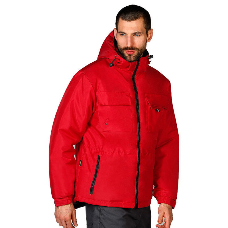 Jacket, high collar with hood, back panel longer than the front, fully zippered, three chest pockets with flaps, two big pockets with covered zip, one pocket inside, zipper on the inside back for easier printing access