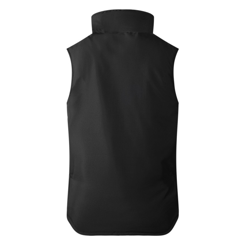 Bodywarmer, high collar, back panel longer than the front, fully zippered, five pockets, three of which with flap and velcro, two big pockets with covered zip, big pocket for mobile phone, one pocket inside, zipper on the inside back for easier printing access