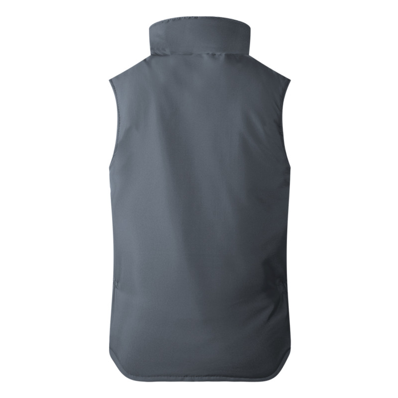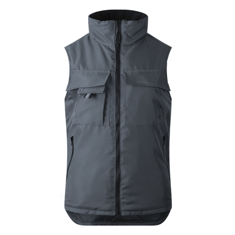 Bodywarmer, high collar, back panel longer than the front, fully zippered, five pockets, three of which with flap and velcro, two big pockets with covered zip, big pocket for mobile phone, one pocket inside, zipper on the inside back for easier printing access