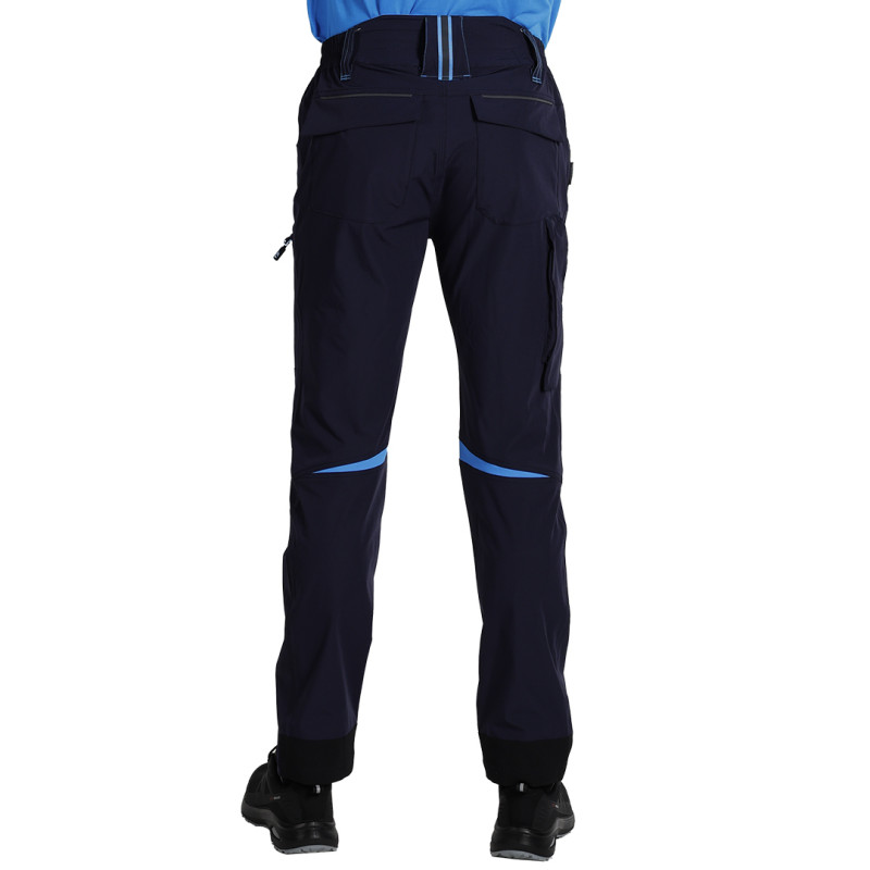 Elastic work pants made of 4-way stretch nylon, 140 g/m², with an extended waistband at the back. Two front pockets, two back pockets with flaps, two zippered pockets, triple stitching for reinforcement, additionally reinforced material on the back of the ham, reflective details.