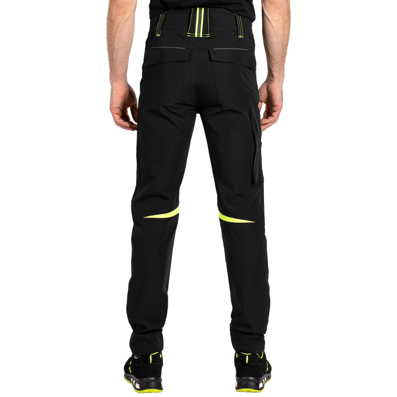 Elastic work pants made of 4-way stretch nylon, 140 g/m², with an extended waistband at the back. Two front pockets, two back pockets with flaps, two zippered pockets, triple stitching for reinforcement, additionally reinforced material on the back of the ham, reflective details.