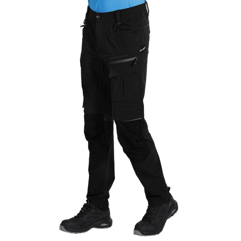 Elastic work pants made of 4-way stretch nylon, 260 g/m², with an extended waistband at the back, reinforcements on the knees and the back ham. Two front pockets, two back pockets with flaps, two multifunctional leg pockets, triple stitching for reinforcement, reflective details.
