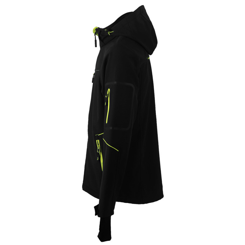 Softshell jacket with a hood, brushed fleece lining, and reflective details. The hood and hem feature adjustable elastic drawcords. Sleeves have Velcro straps for width adjustment at the cuffs and thumbholes. Two front zippered pockets, a chest pocket, and a sleeve pocket. The YKK waterproof zipper provides extra protection against moisture.