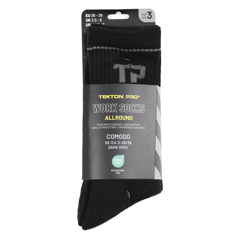 All-round work socks made of 75% cotton22% polyamide 3% elastane, with reinforced heel and cushion pad and reinforced toe, breathable mesh and arch support on top of foot