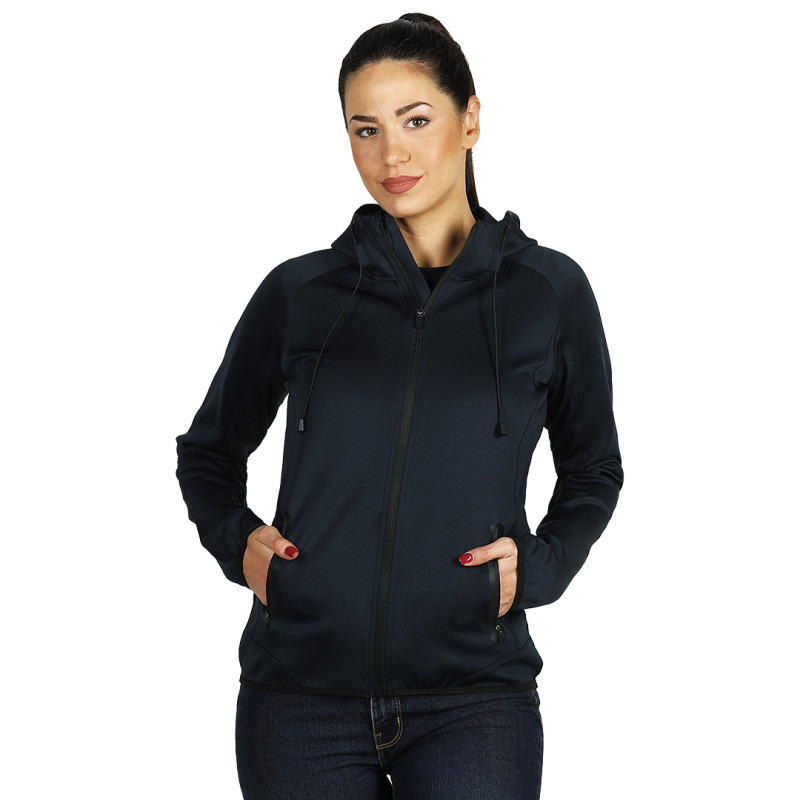 Women’s sweatshirt, 280 g/m2, adjusted fit, fully zippered, elasticated adjustable drawstrings with stoppers in the hood, two front zippered pockets, elasticated trimming around sleeves and bottom