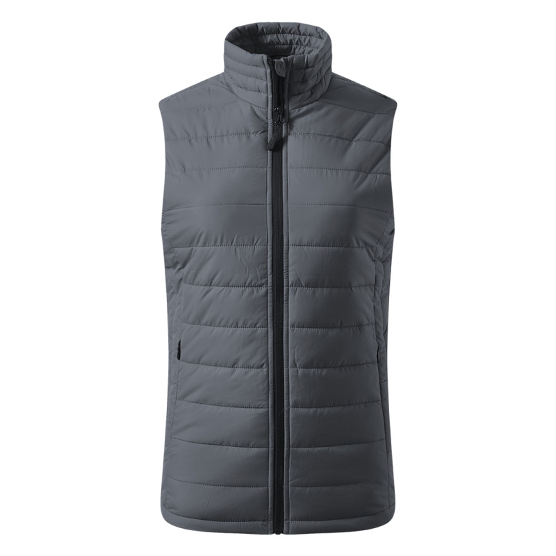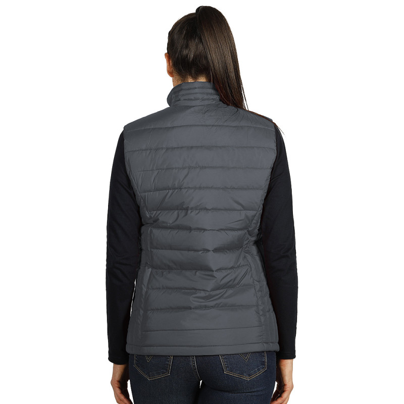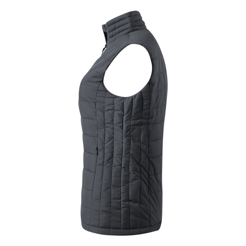 Women's bodywarmer, adjusted fit, high collar, two front and inner zippered pocket, with invisible zipper on the inside back bottom for easier printing access