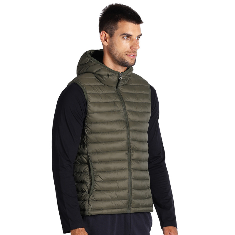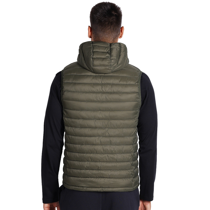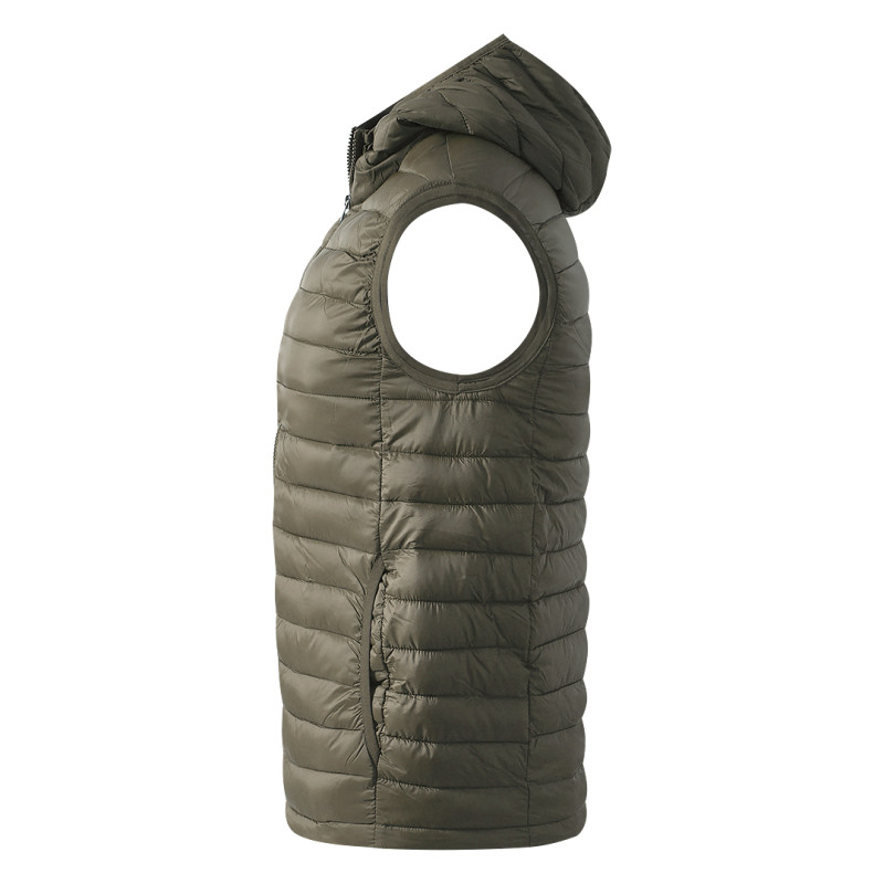 Bodywarmer, slim fit, light padded, two front pockets, elasticated trimming around armholes, hood and bottom
