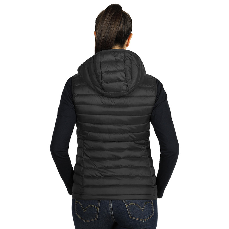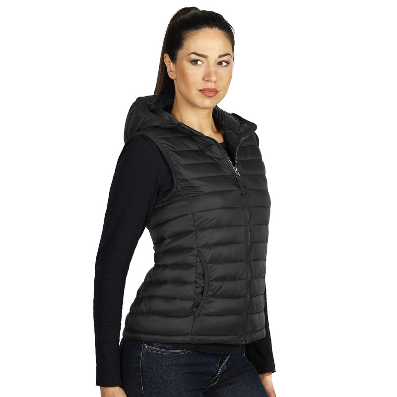 Women's bodywarmer, slim fit, light padded, two front pockets, elasticated trimming around armholes, hood and bottom
