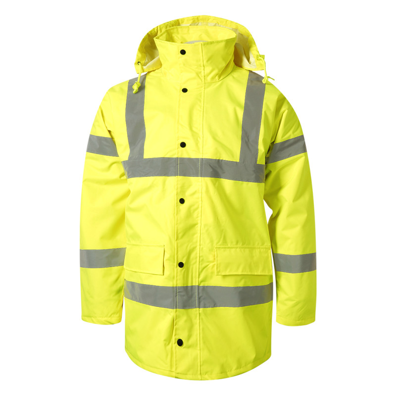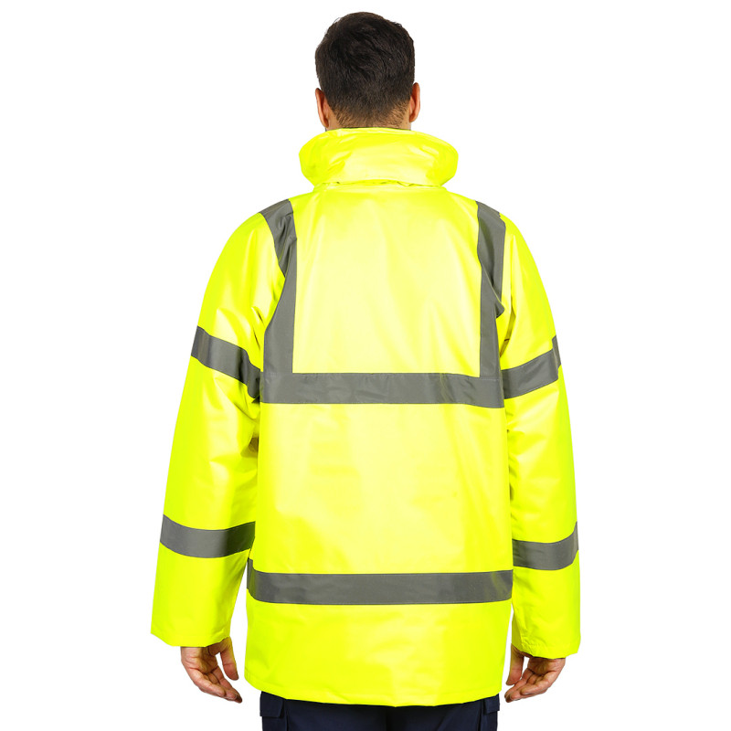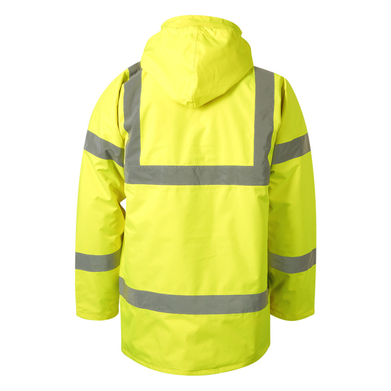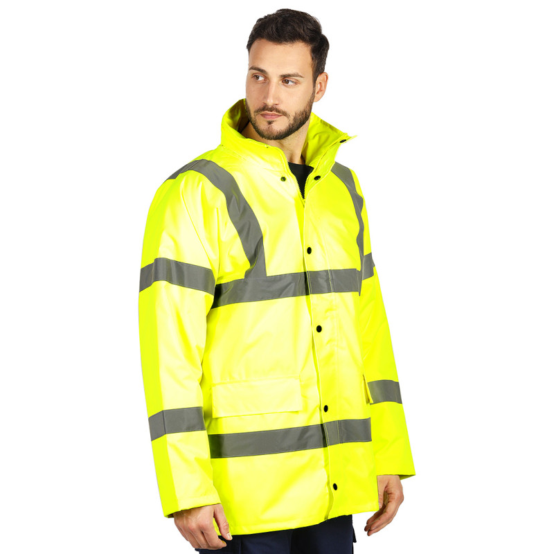 Fluorescent parka with two reflective tapes at front and back, one tape over the shoulders, two tapes at sleeves, fabric with stain resistant finish, high collar, fully zippered with two-way zip, flap with press studs, detachable hood with drawstrings concealed in collar closed with velcro, cuffs inside sleeves for additional protection from cold, waterproof seams, two front pockets with flaps and two inner pockest, zipper on the inside back for easier printing access